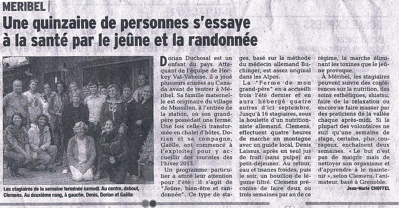 Article sur « Jeûne et Randonnée » dans le Dauphiné Libéré Savoie